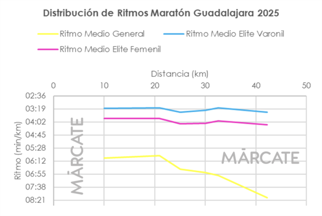La caída de ritmo de la línea amarilla (población general) es evidente, mientras los corredores de élite (línea azul y rosa) mantienen relativamente su ritmo durante toda la carrera.