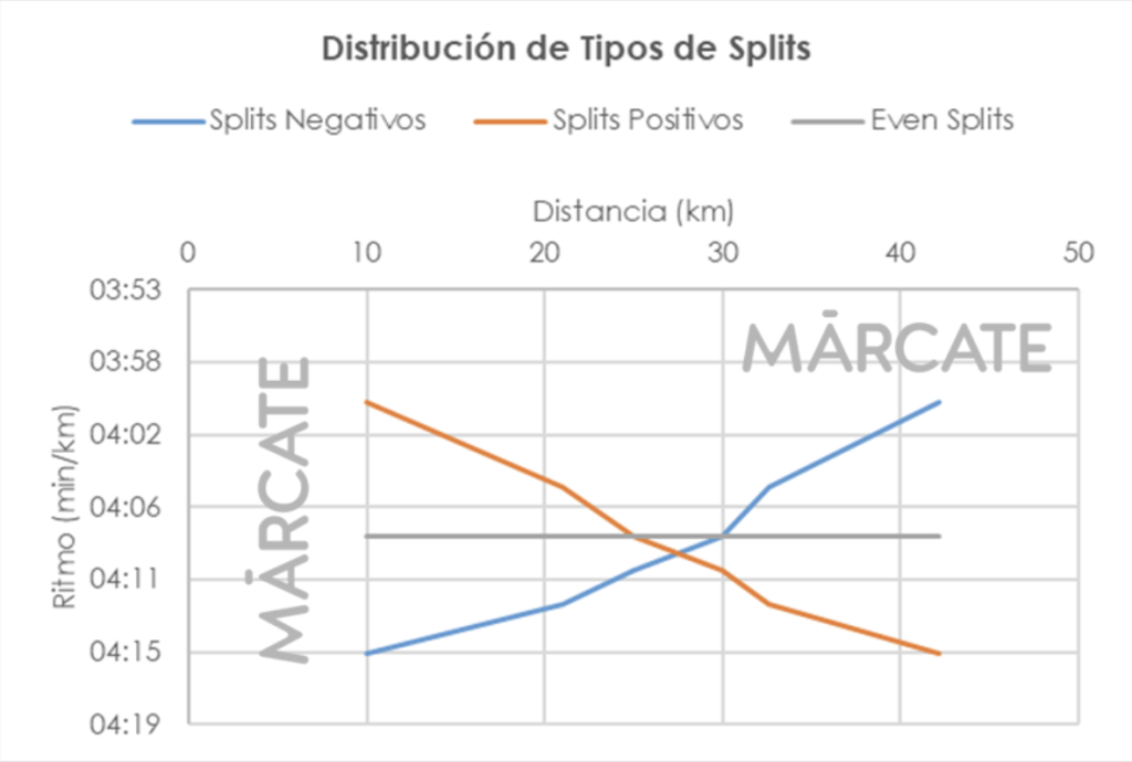 Splits Positivos: lo contrario; se arranca rápido y el ritmo se degrada conforme avanza la carrera.