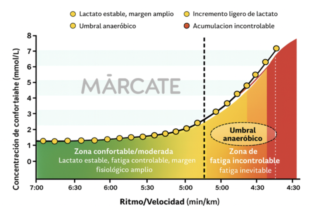 Este gráfico es un ejemplo de la producción de lactato (puede entenderse como acumulación de fatiga) según el aumento de ritmo de carrera. También puedes ubicar las famosas ZONAS que aparecen en tu reloj, de la verde a la roja.